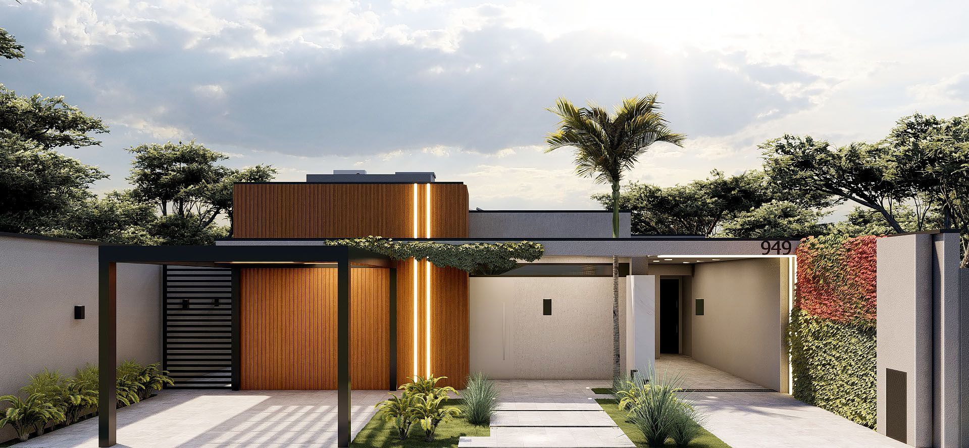 Fachada e interiores para residência unifamiliar, com 170m² distribuídos em 01 pavimento. Premissas do projeto: acessibilidade, funcionalidade e cores neutras.