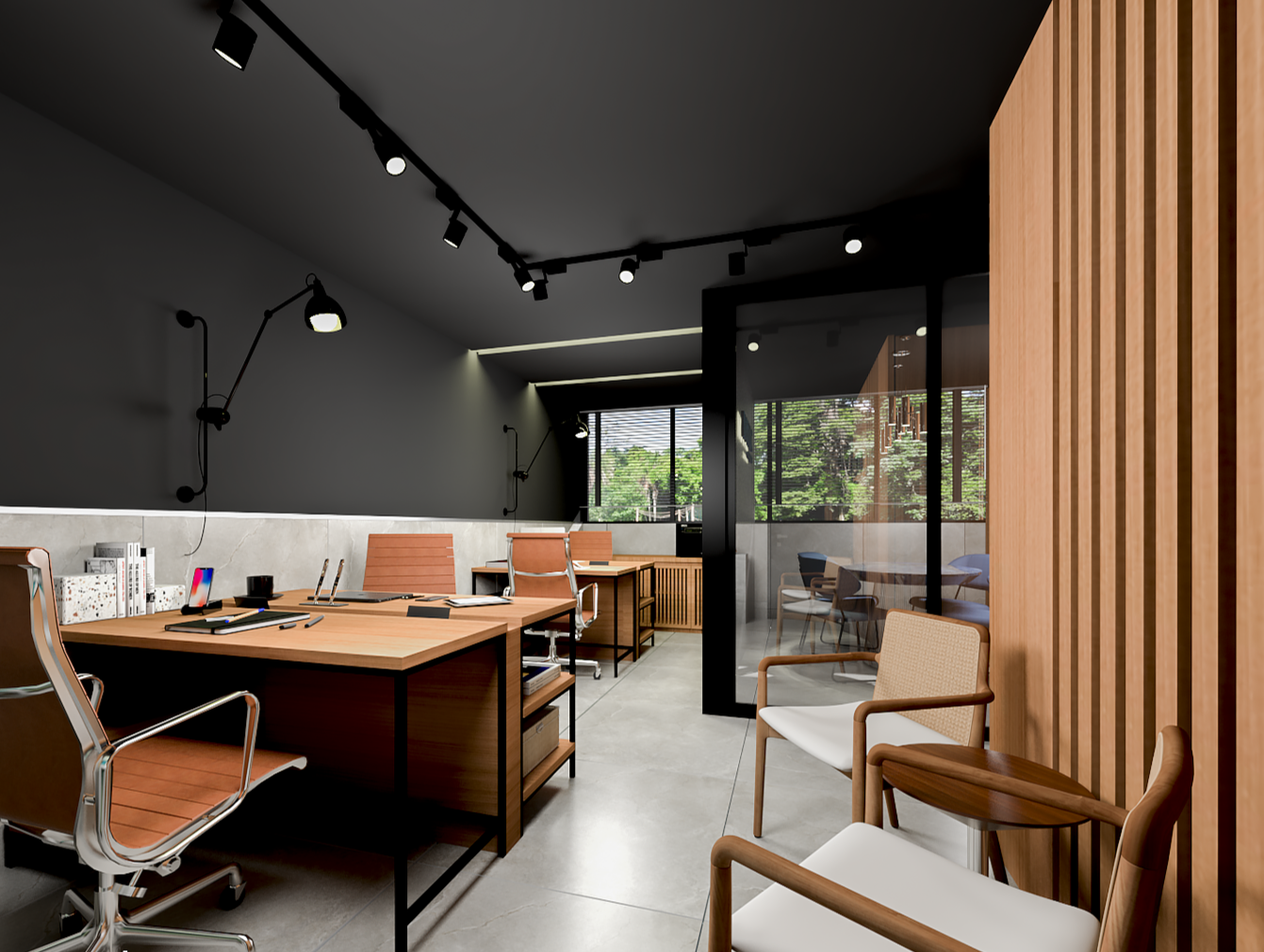 Interiores para uma sala comercial com 35m². Premissas do projeto: iluminação, cores escuras e madeirado.