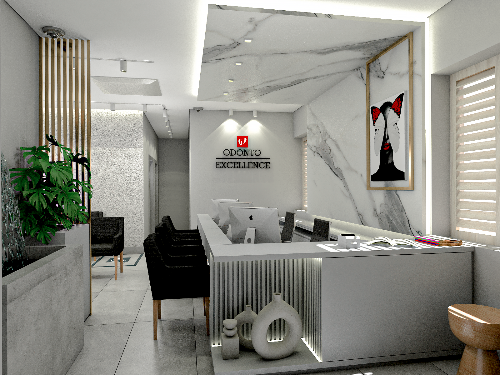 Interiores para complexo odontológico, com 190m² distribuídos em 02 pavimentos. Premissas do projeto: tons claros, mármorizados e iluminação.