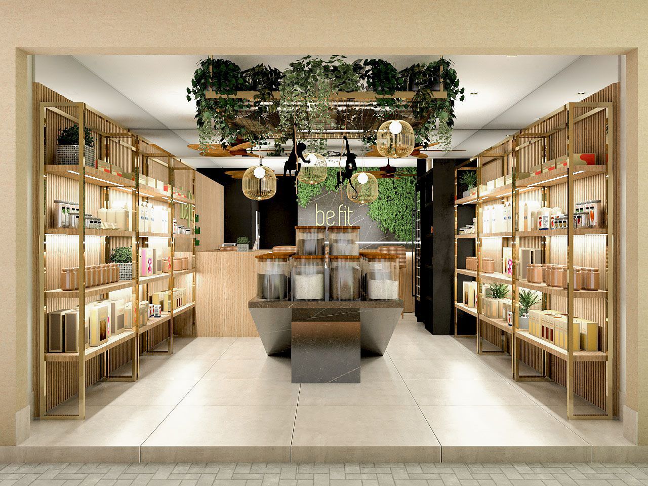 Fachada e interiores para um ambiente comercial com 43m². Premissas do projeto: madeira, metais e impacto visual.