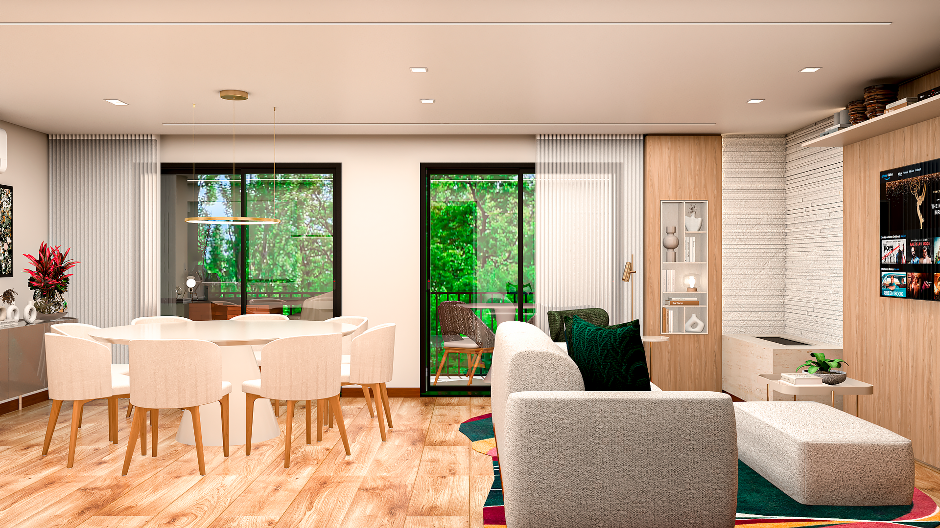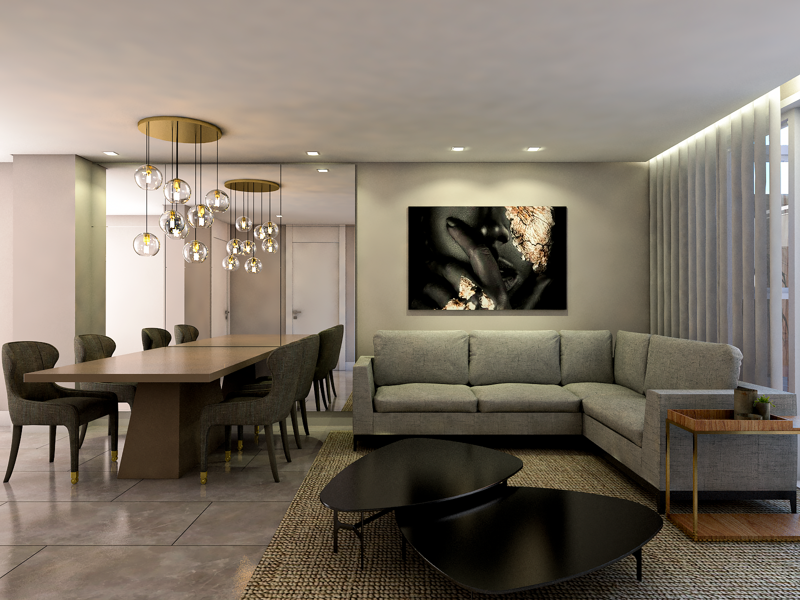 Interiores para apartamento com 90m². Premissas do projeto: linhas retas, iluminação e funcionalidade.