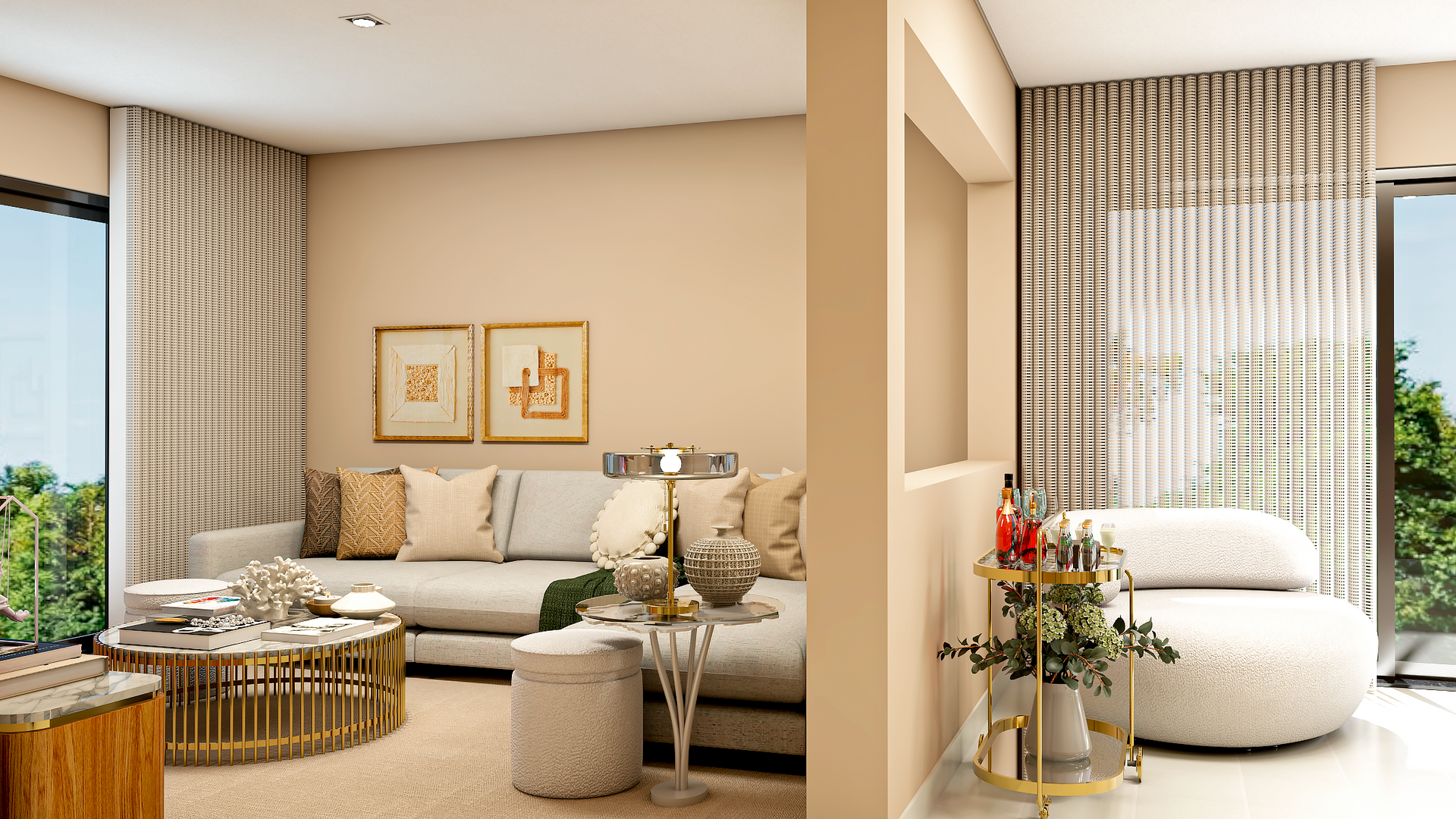 Interiores para residência unifamiliar, com 285m² distribuídos em 02 pavimentos. Premissas do projeto: bar/ adega, mobiliário solto e cores claras.